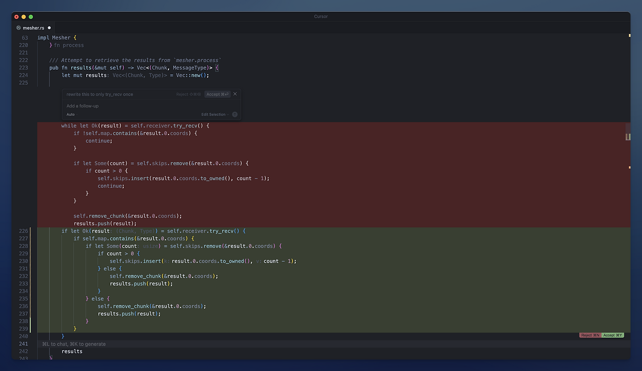 인라인 코드 편집 | 코드 라인 내에서 바로 AI 편집을 적용 | Cmd/Ctrl + K |