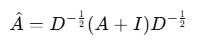 노드 개수에 따른 정규화를 위해 논문( Semi-Supervised Classification with Graph Convolutional Networks )에서는 정규화된 인접 행렬(hat A)를 다음과 같이 정의합니다.