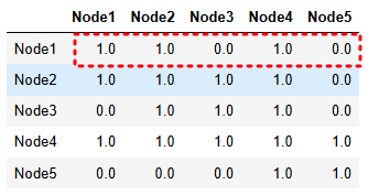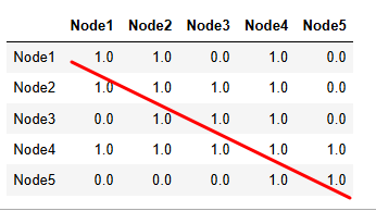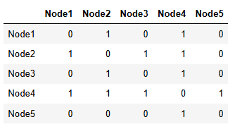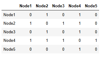 5개의 노드를 가진 그래프와, 그래프를 인접행렬로 나타낸 예입니다.