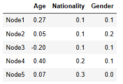 가중치 생성 예입니다. 입력차원이 Age, Nationality, Gender 3개이고, 출력차원은 4개로 생성합니다.