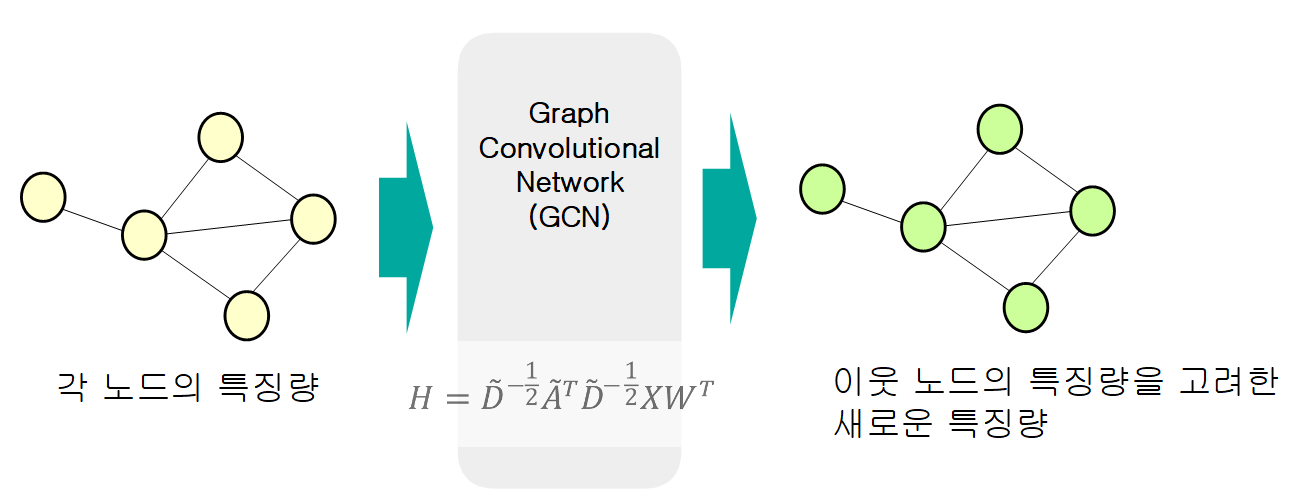 이 과정을 통해 GCN은 노드 자체의 특징과 이웃 노드의 특징을 통합하고 그래프 구조를 반영한 새로운 노드 표현을 학습합니다.