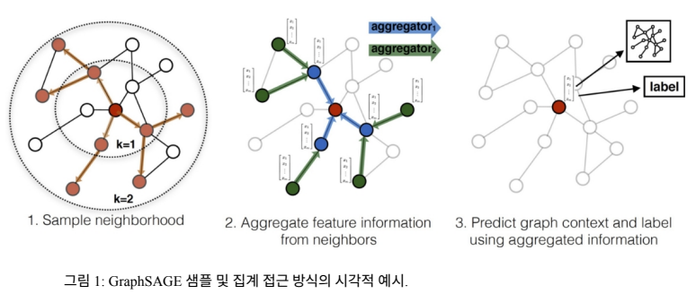 "집계(aggregate)": 이웃 노드의 특성을 Mean, Max-Pooling, LSTM 등의 방법으로 집계합니다.