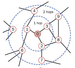 노드에 직접적으로 연결된 이웃노드를 1홉 이라하고, 이웃의 이웃은2홉이라고 합니다.
