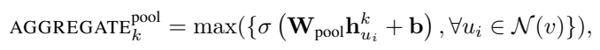 이웃 노드의 특성에 비선형 변환σ(W⋅h)을 적용한 뒤, 각 차원별로 최댓값(max)을 집계.