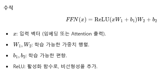 Attention 은 단어간의관계를 학습하지만, FFN은 입력된 각 단어 벡터를 독립적으로 변환하여, 단어 자체의 특징을 학습합니다. 즉 단어와의 영향을 배제하여, 각각의 단어의 관계를 고려하지 않습니다.