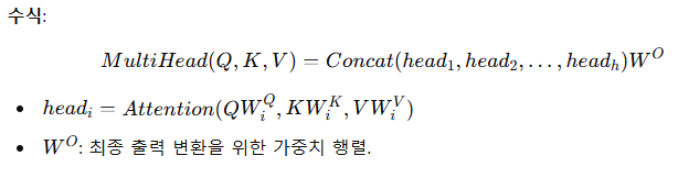 - 개념: Attention을 병렬적으로 여러 개 계산하여 다양한 표현을 학습하는 방식.